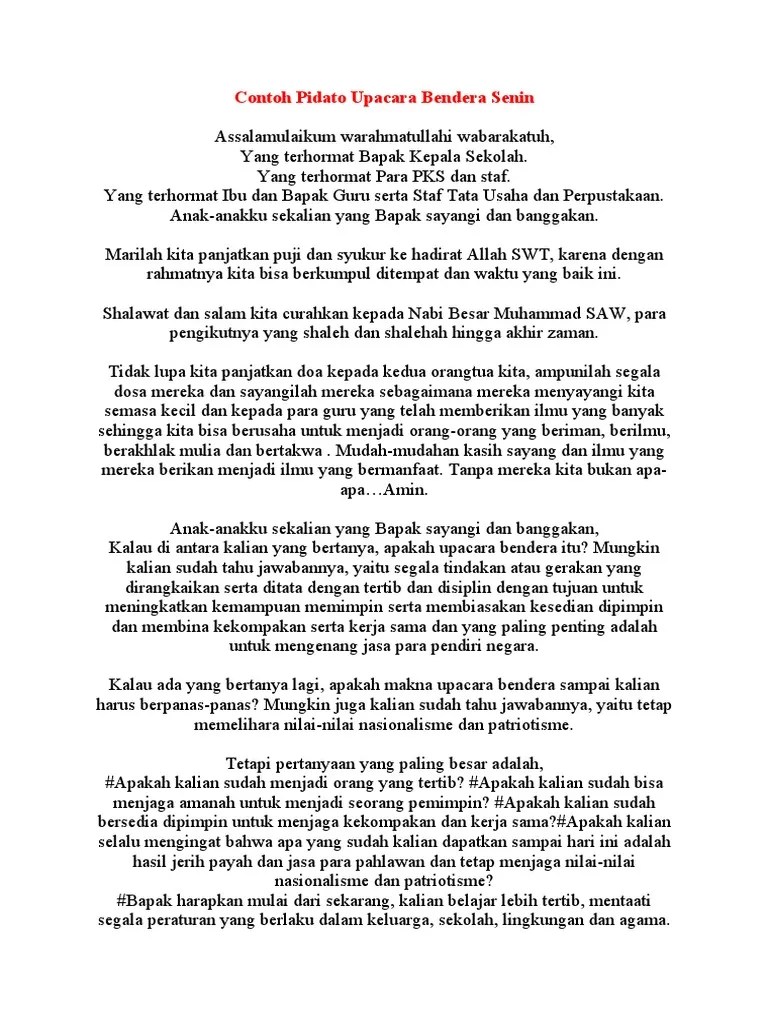 Dilihat dari gambaran itu, tidak ada alasan kalau guru tidak bisa berkomunikasi kalau diminta menjadi pembina upacara, sedangkan audiens yang. Dan merupakan suatu hal yang wajar jika sekolah memberikan sanksi kepada siapa pun siswai yang. contoh pidato upacara bendera zona ilmu 6. Kepala smp n 157 jakarta, bp. Anda bisa menggunakannya tanpa mengeditnya atau juga bisa memodifikasi dan mengembangkan contoh pidato ini.