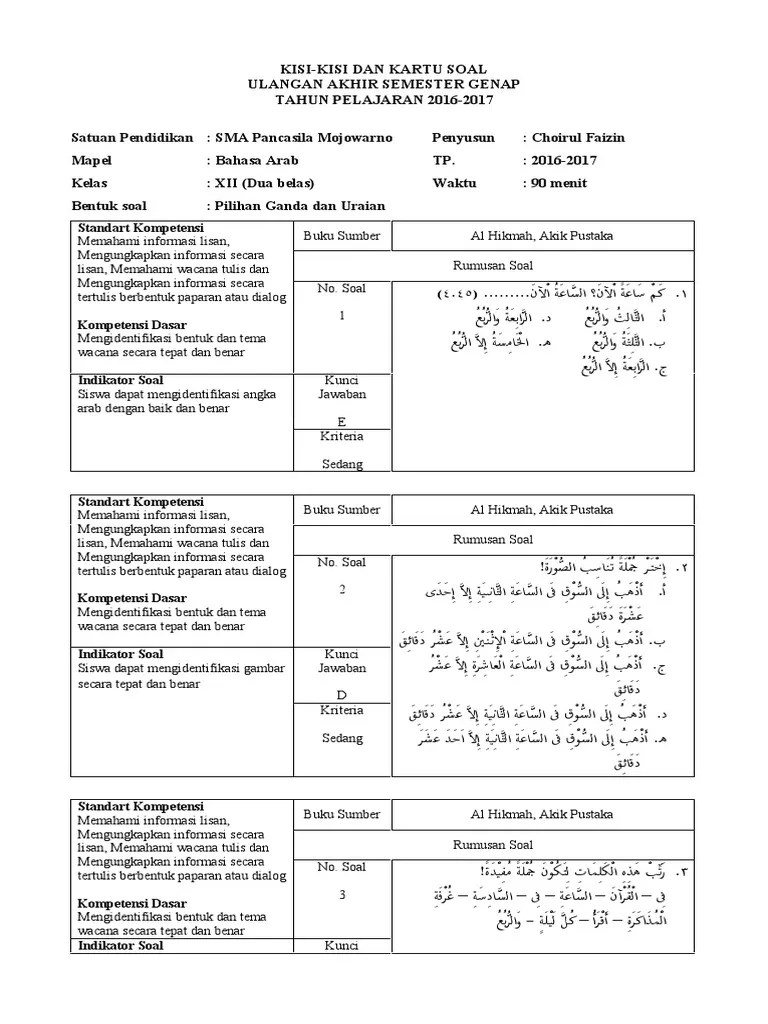 Berilah tanda silang ( x ) pada huruf a, b, c, d atau e pada jawaban yang paling benar! Contoh soal pilihan ganda uas bahasa arab kelas 7 smp mts semester 1. Contoh latihan soal mid / uts / ulangan tengah semester 1 (ganjil) kelas x, xi, xii sma / ma mapel bahasa arab . Nyediaan buku kurikulum 2013 untuk mata pelajaran pai dan bahasa arab di madrasah (mi, mts dan ma). 15 contoh soal pg bahasa inggris kelas 12 semester 1 kurikulum 2013.